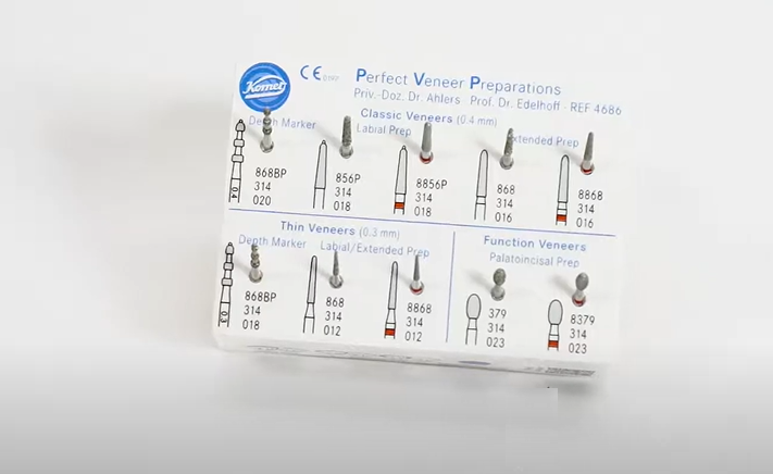 Perfect Fineer Voorbereidingen Set 4686ST in een roestvrijstalen standaard. De keramische veneers van Komet, hebben zichzelf bewezen als een serieus behandelalternatief.